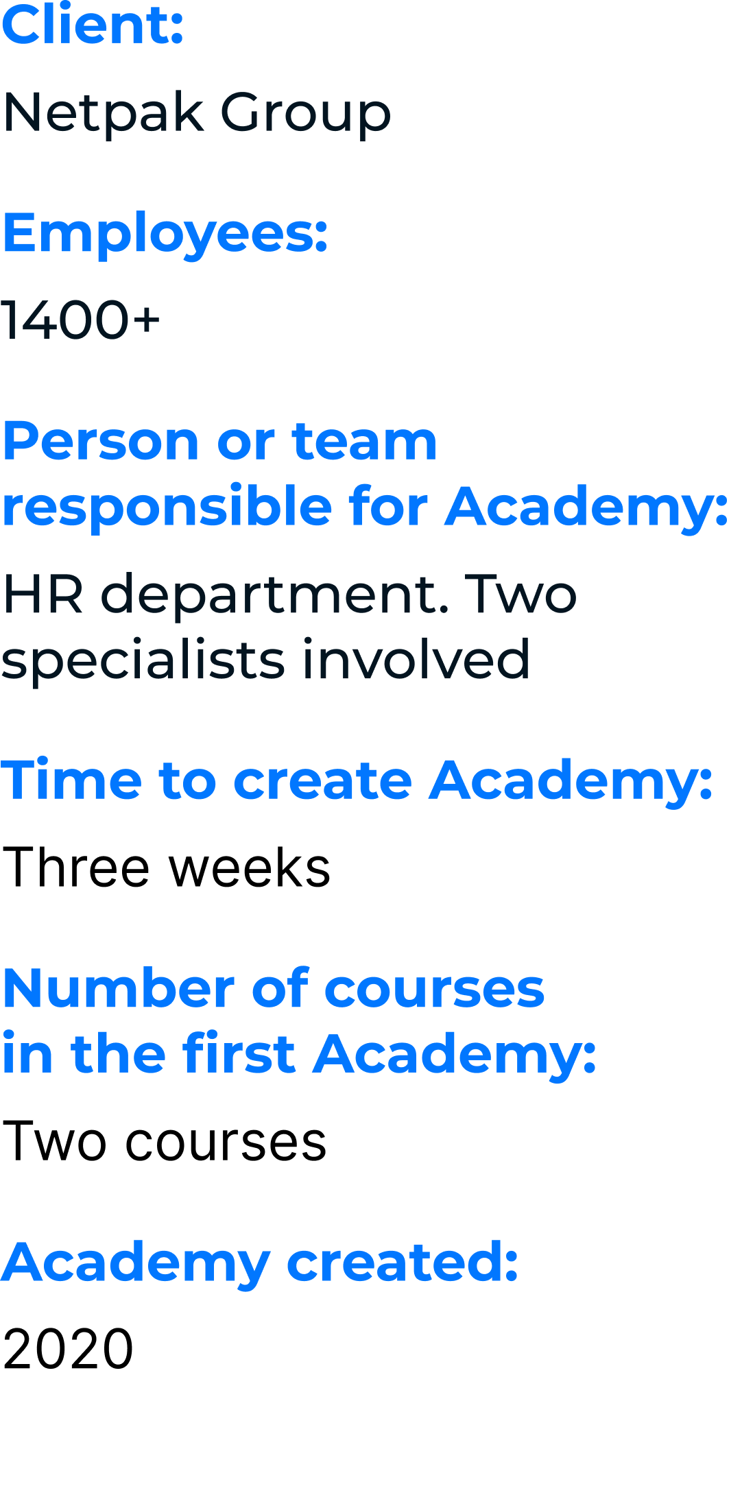 "After we launched the internal Netpeak Group Academy, we were able to save about 192 hours of labor per month, predominantly in areas related to company policy, manuals, and descriptions of processes both in the entire company and in separate departments where different employees work"