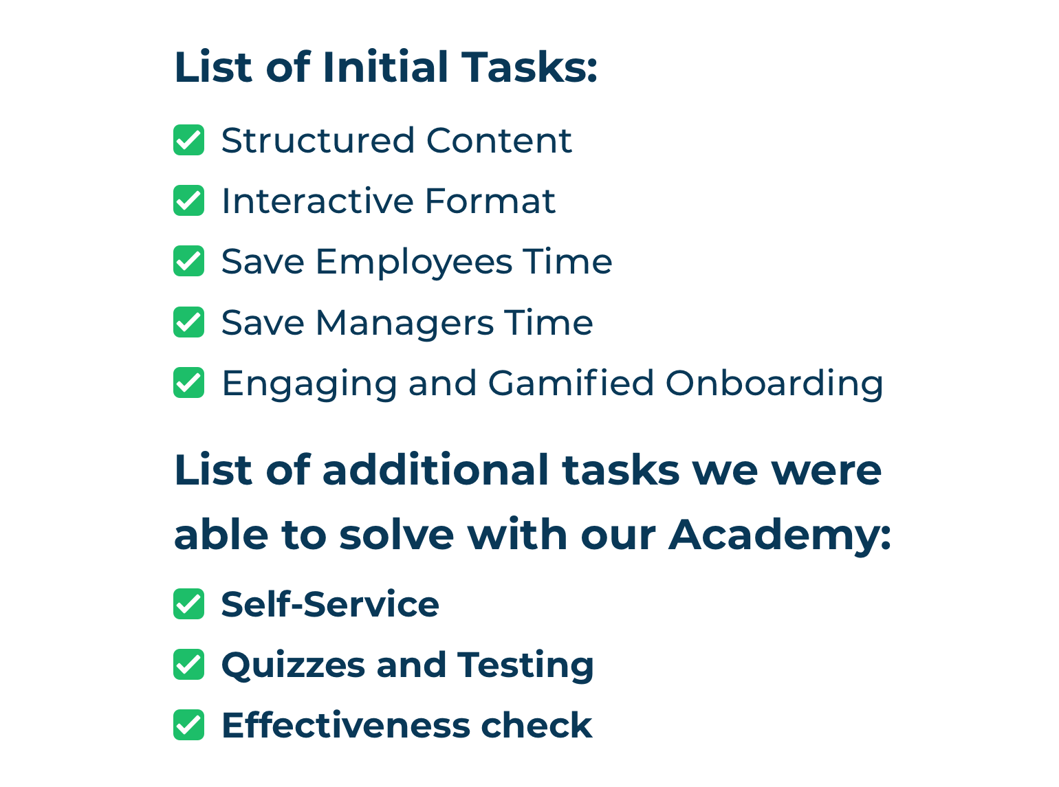 Before we tried various methods of organizing this information (we would often use Wiki, Google Doc + Google Forms, which wasn't that effective for onboarding), but we ultimately settled on an Academy, where we can guide new hires step by step, systematically, right from their first hours on the job.