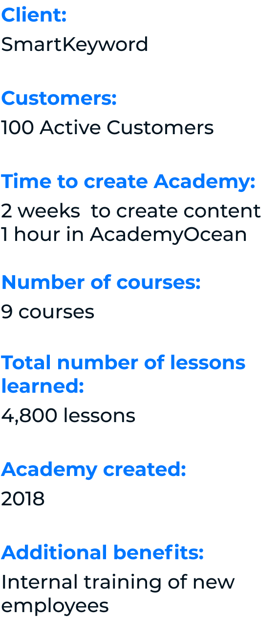 More than 4,800 lessons have been completed by over 300 learners in the past 12 months. Since we have about 100 clients, this means that, on average, three employees at each client company have taken courses in the SmartKeyword Academy.