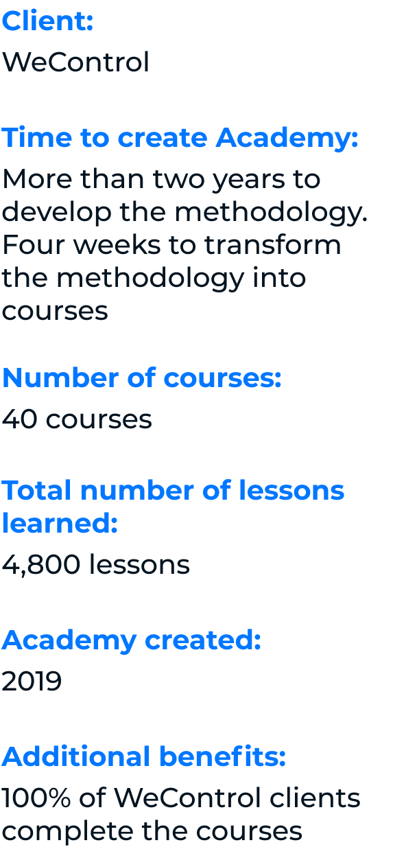 "At this point, we can't imagine WeControl without our GDPR Academy, which came into fruition with the help of AcademyOcean. This Academy is closely intertwined with our platform, and 100% of our clients take this educational course"