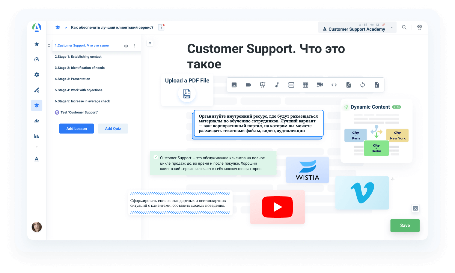 В редакторе курсов AcademyOcean можно создавать интерактивный обучающий контент. Урок может содержать текст, картинки, аудио, видео и многое другое. Вы даже можете встроить Google календарь или карты!