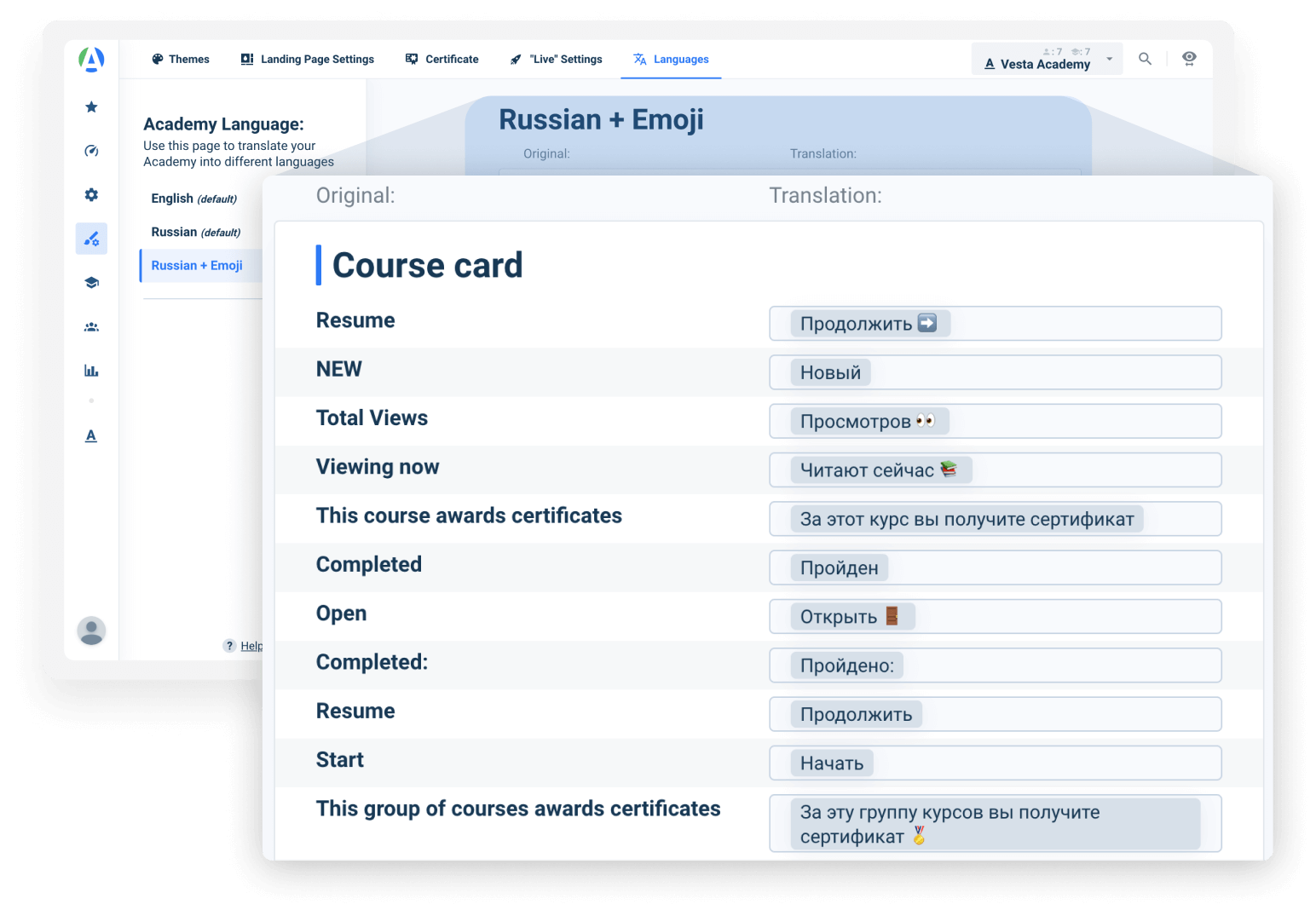 Вы можете перевести их на разные языки, добавить любые символы и emoji. Сделайте ваш учебный портал уникальным!