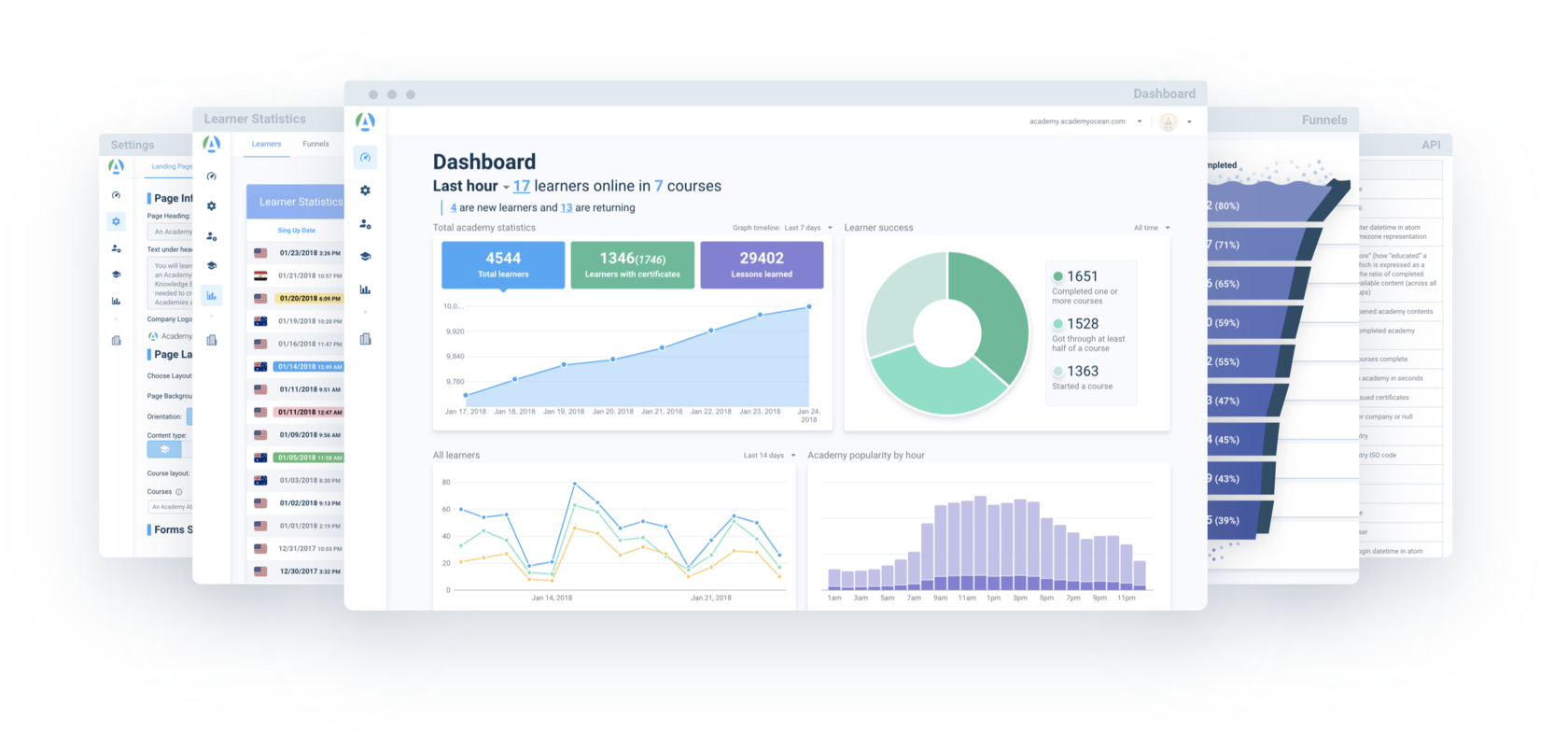 Современный UI/UX дизайн и понятный интерфейс AcademyOcean продуман с учетом удобства как администраторов, так и учеников. Он позволит сосредоточиться на своих целях, не теряясь среди множества разделов и кнопок.