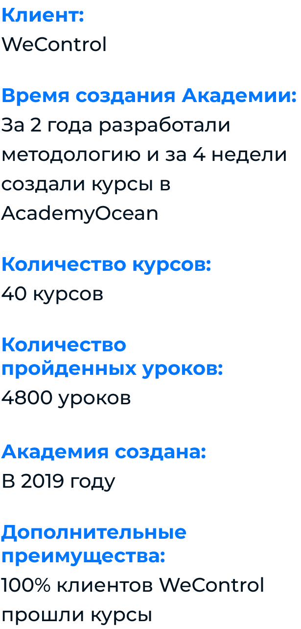 «На данный момент мы не можем представить WeControl без нашей Академии GDPR, которая была создана с помощью AcademyOcean. Эта Академия тесно связана с нашей платформой, и 100% наших клиентов проходят обучение»