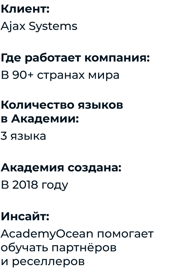 «С помощью AcademyOcean мы запустили с нуля корпоративную Академию Ajax всего за несколько недель. Хочу отметить замечательный UI/UX как для администраторов, так и для конечных пользователей (наших сотрудников и партнёров). AcademyOcean очень прост в использовании, даже если вам необходимо создать мультиязычную Академию (Ajax ведёт бизнес в 90+ странах)»