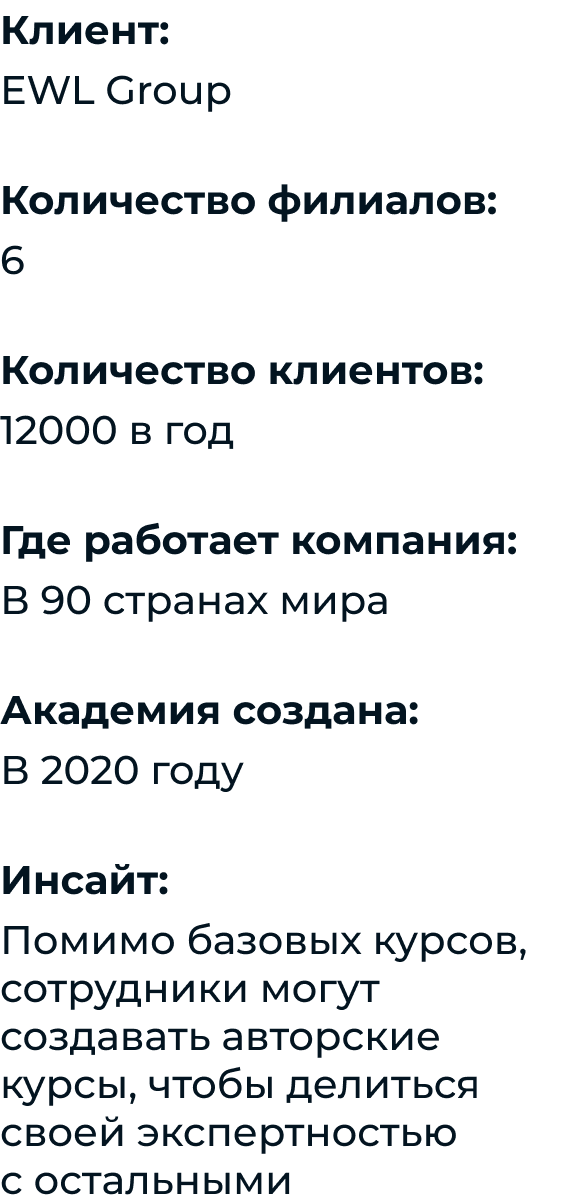 Внутри коллектива EWL принято делиться знаниями, так что, помимо базовых курсов, каждый сотрудник может предложить свой авторский курс или серию курсов, а также записаться на курсы коллег.