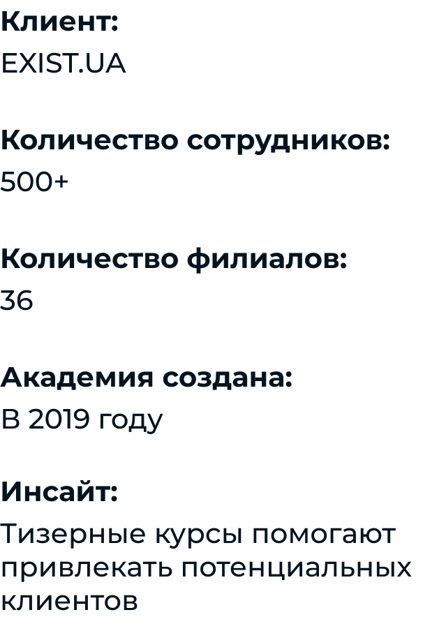 Компания EXIST.UA — крупнейший в Украине интернет-магазин автозапчастей. Работают с 2008 года, и имеют 36 филиалов и представительства во всех областях страны. В разделе «О компании» первым пунктом среди ценностей выделяют «Заинтересованный и обученный персонал». Поэтому нам особенно приятно было, когда в прошлом году Exist обратился в AcademyOcean, чтобы мы помогли запустить им Академию для сотрудников.
