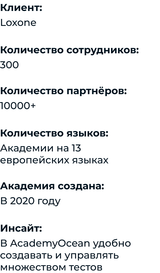 У Loxone 300 сотрудников и более 10 000 партнеров. К нам в AcademyOcean они обратились в начале 2020 года, чтобы мы помогли им выстроить систему обучения и тестирования для партнеров в разных странах.