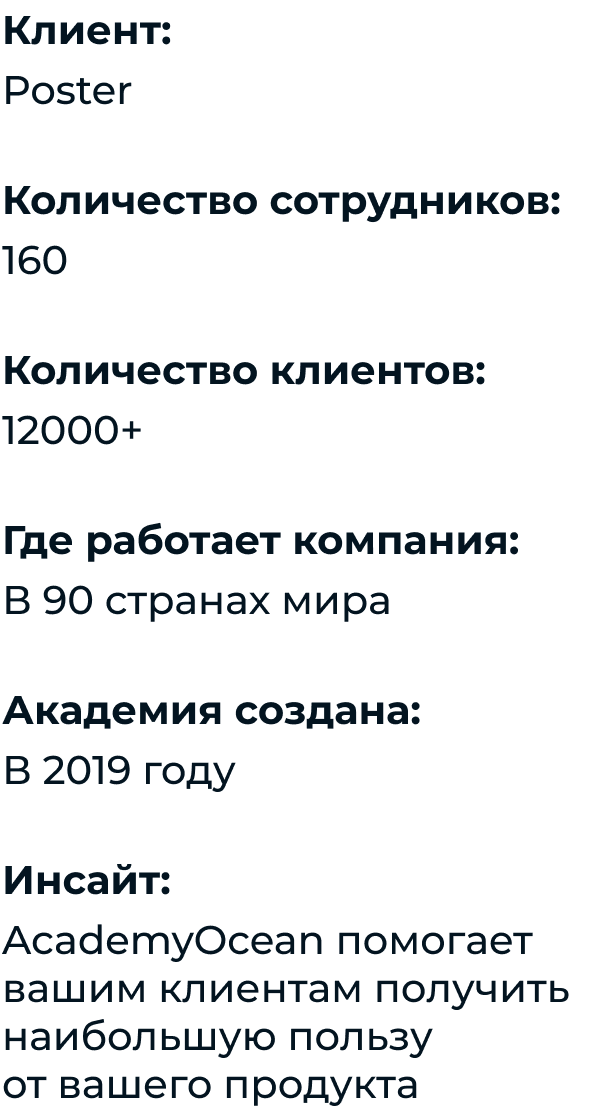 Poster обратились в AcademyOcean, чтобы создать Академию для клиентов. Они обучают их, как пользоваться системой, и как получить от неё наибольшую пользу.