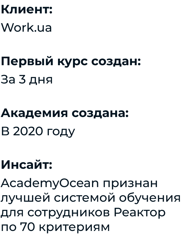 На мой взгляд, AcademyOcean — это система, которая сделана по-настоящему хорошо: просто, понятно, удобно. Первый курс в ней мы сделали за 3 дня, потому что нам не пришлось читать инструкции и бороться со сложностями. Ты просто берешь и делаешь!»