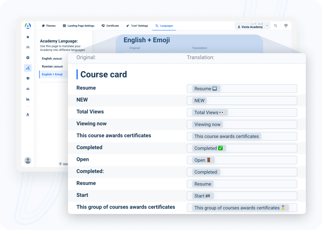 С помощью нашей разработки вы сможете сделать ваш учебный портал уникальным: создать свои тексты для интерфейса на разных языках, с любыми символами и даже emoji.