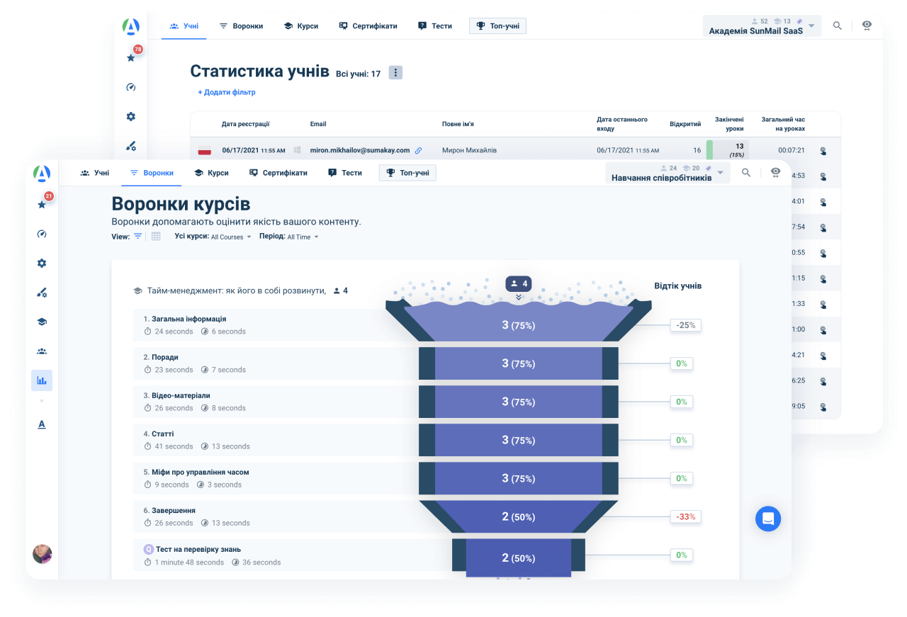 У звітах є зручні фільтри та можливість вивантаження у таблиці. А інструмент аналітики «Воронка» допоможе вам наочно оцінити та покращити якість навчальних матеріалів.