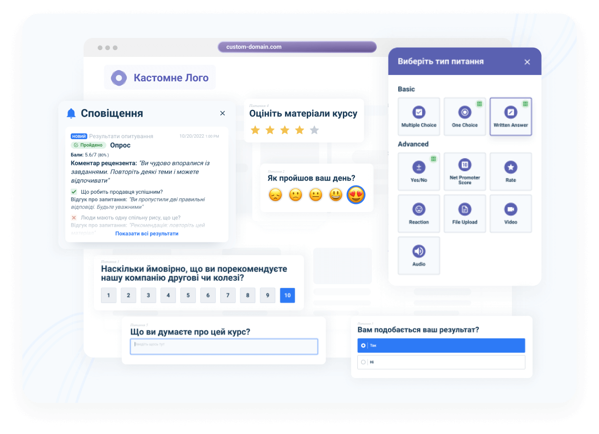 Створіть унікальну екосистему для ваших учнів та клієнтів. В особистому кабінеті доступна вся інформація щодо доступних курсів, прогресу навчання, сертифікацій. Ви можете легко налаштувати зовнішній вигляд порталу під ваш бренд та вибрати потрібну мову.