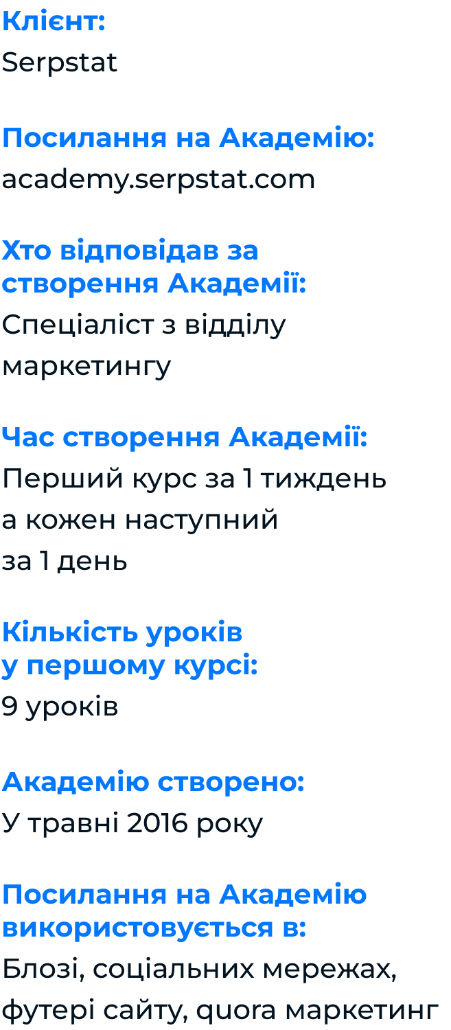 — партизанський маркетинг. Наприклад, коли ми бачили актуальне питання на Quora, ми писали коротку відповідь і давали посилання на курс, в якому було дано більш докладну відповідь. Кожен, хто бачить це посилання, може розпочати навчання в нашій Академії та прокачати свої знання.