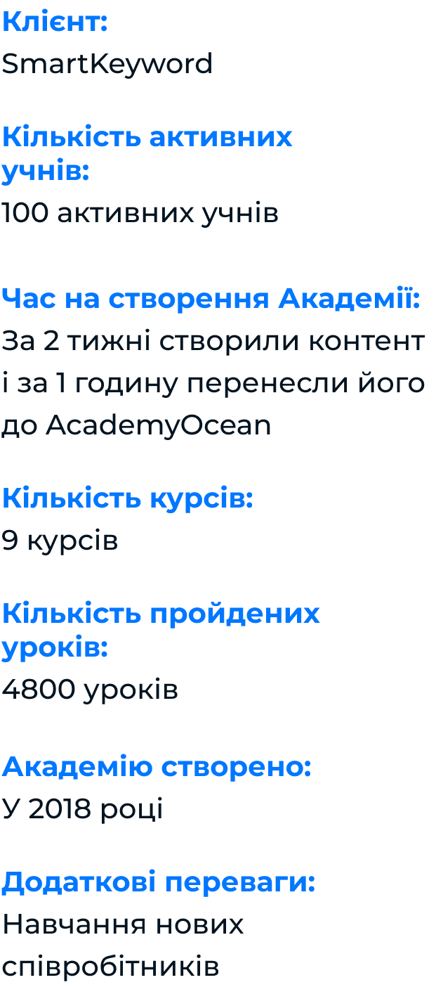 Серед іншого, ми пропонуємо своїм клієнтам SmartKeyword Академію, щоб вони розвивали свої знання в галузі SEO. Завдяки їй наші клієнти зможуть самостійно керувати своєю стратегією просування.