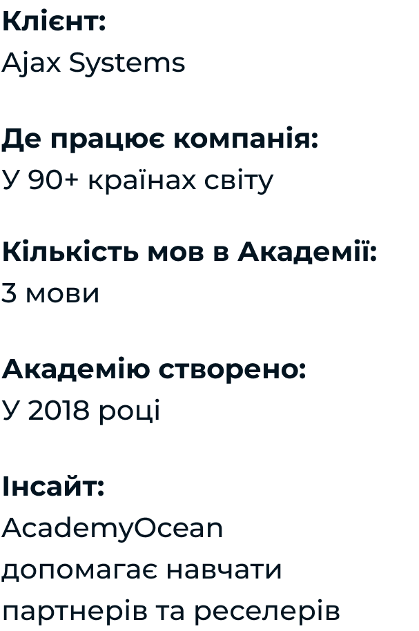 «За допомогою AcademyOcean ми запустили з нуля корпоративну Академію Ajax лише за кілька тижнів. Хочу відзначити чудовий UI/UX як для адміністраторів, так і для кінцевих користувачів (наших співробітників та партнерів). AcademyOcean дуже проста у використанні, навіть якщо вам необхідно створити мультимовну Академію (Ajax веде бізнес у 90+ країнах)»