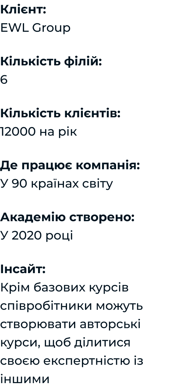 Всередині колективу EWL заведено ділитися знаннями, отже, окрім базових курсів, кожен співробітник може запропонувати свій авторський курс чи серію курсів, і навіть записатися на курси колег.