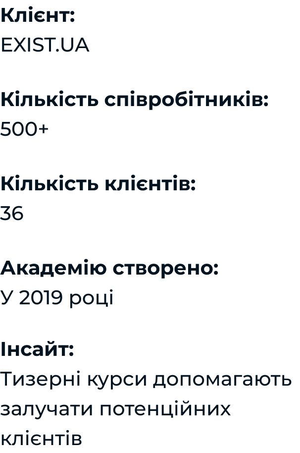 Компанія EXIST.UA - найбільший в Україні інтернет-магазин автозапчастин. Працюють з 2008 року і мають 36 філій та представництва у всіх областях країни. У розділі «Про компанію» першим пунктом серед цінностей виділяють «Зацікавлений та навчений персонал». Тому нам особливо приємно було, коли минулого року Exist звернувся до AcademyOcean, щоб ми допомогли запустити їм Академію для співробітників.