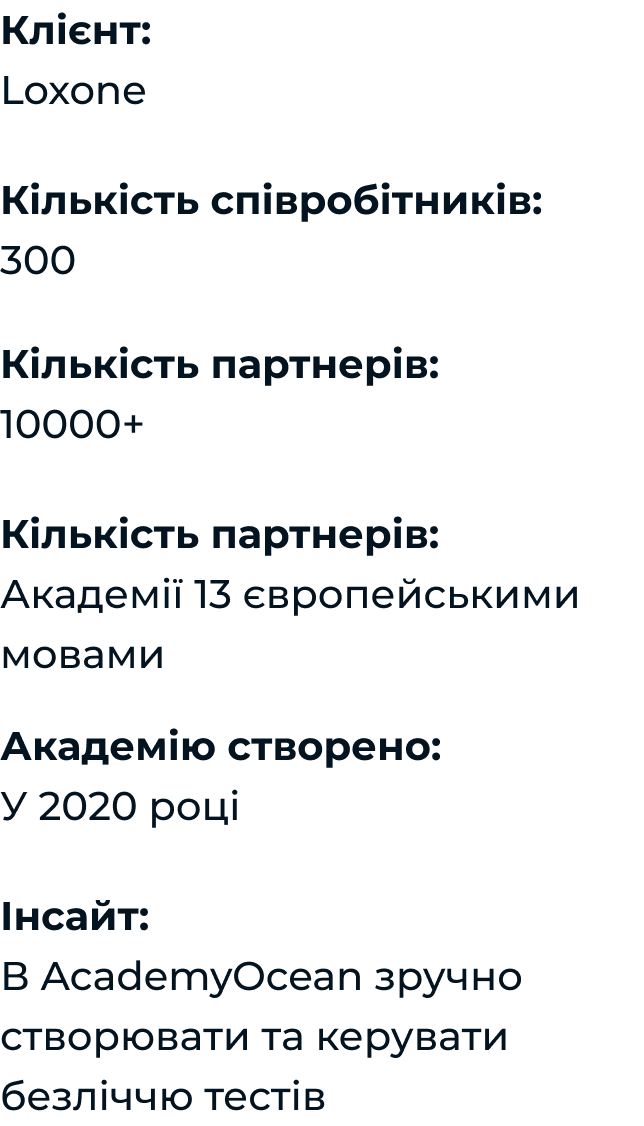 Loxone має 300 співробітників і більше 10 000 партнерів. До нас в AcademyOcean вони звернулися на початку 2020 року, щоб ми допомогли їм побудувати систему навчання та тестування для партнерів у різних країнах.