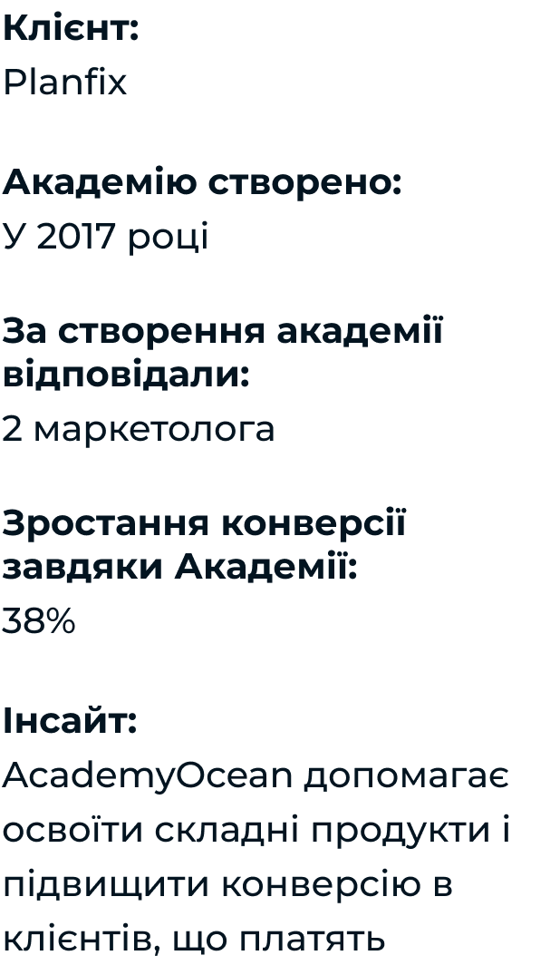 З командою Planfix ми знайомі давно. І коли AcademyOcean тільки з'явилася, ми поділилися з ними ідеєю, й вони одразу вирішили зробити академію.
